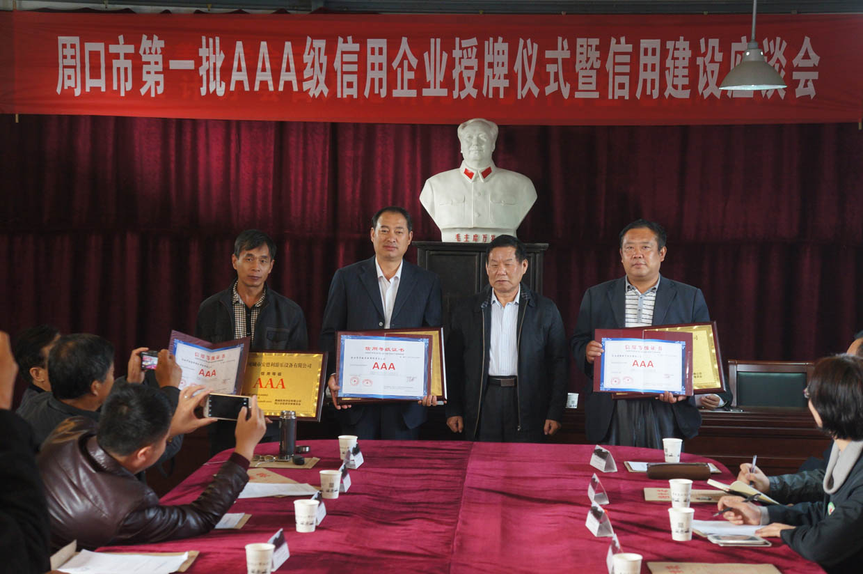 10月23日上午,周口市AAA级信用企业授牌仪式暨信用建设座谈会在周口市华威实业有限责任公司(周口华威民俗文化博物苑)召开。原周口市政协副主席、周口市信用建设促进会会长石敬平,副会长韩洪然、蔡建铭、李运明等领导出席会议。项城市、商水县、郸城县、沈丘县促进会代表及副会长企业和获评企业等参加会议。会议由市信用建设促进会副会长韩洪然主持。座谈会上有三家获评企业和副会长企业单位分别发言,周口市信用建设促进会会长石敬平为我市第一批AAA级信用企业授牌并作重要讲话。
